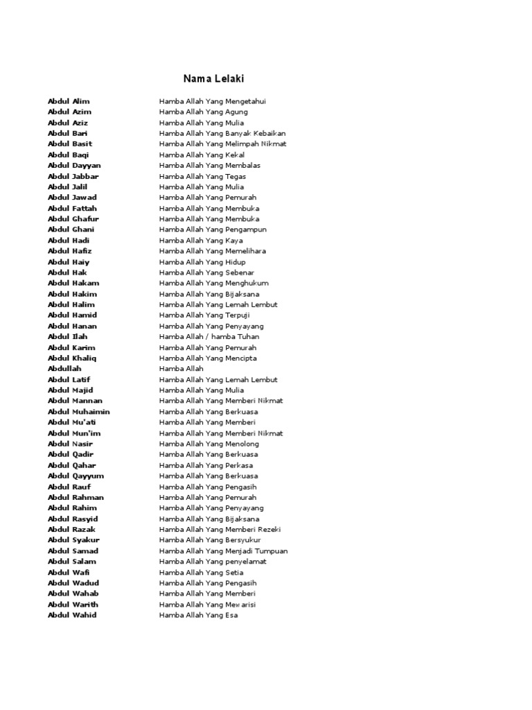 Nama dari bahasa arab bisa menjadi pilihan dalam penamaan buah hati tercinta. Pantas dengan keyakinan umat muslim bahwa kelak di hari akhir, segala manusia akan dipanggil dengan nama mereka abid : Terlihat, kan, sebabnya mengapa nama bayi dalam bahasa arab sangat populer. Ingin menyematkan nama bayi bahasa arab pada si kecil? Tentunya nama arab juga tidak kalah bagusnya dari nama bayi modern lainnya.